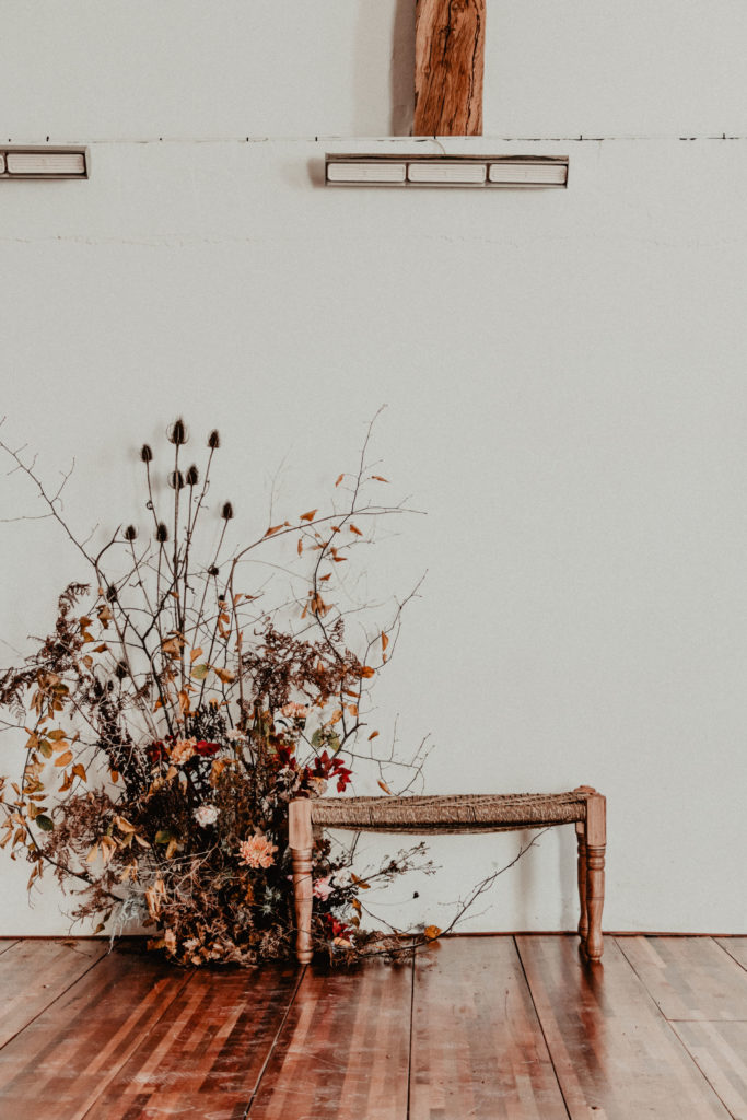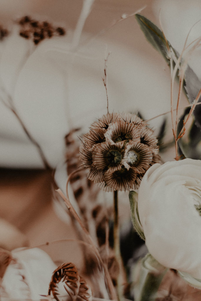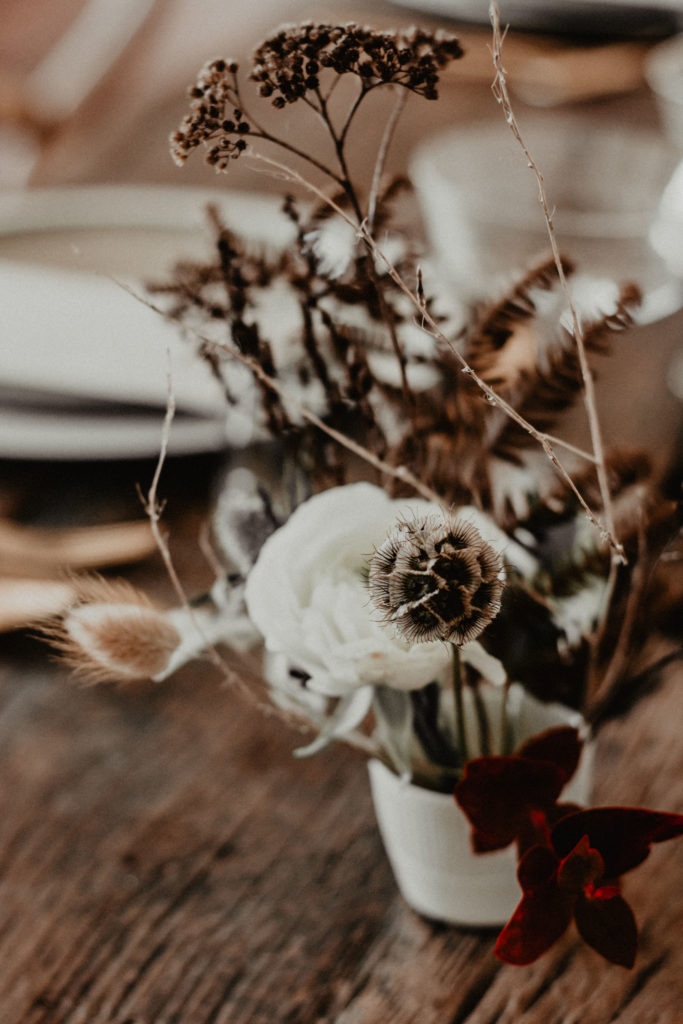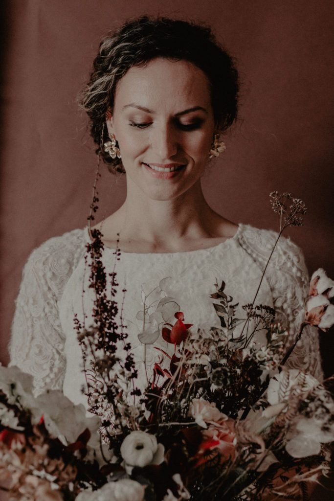 Une mouvance s’est spontanément dégagée dès le début pour ce shooting : l’hiver. Le challenge était d’autant plus intéressant qu’il s’agit d’une saison peu explorée pour les shootings photo, qui ont tendance à tomber dans quelques clichés saisonniers (hiver = neige et feu de bois). Nous avons donc axé notre shooting sur le ressenti hivernal, en mettant en avant des textures et des matières qui se confondent et se complètent dans un environnement naturel aux tons chauds et veloutés. Nos deux mariés d’un jour ont donc vogué dans un univers aux teintes prononcées (caramel, gold, terracotta) assorties à de plus douces (nude, blush, crème). Ce choix, nous avons souhaité le faire vivre par petites touches dans l’intégralité de la scénographie mais aussi au travers du lieu et de sa végétation.