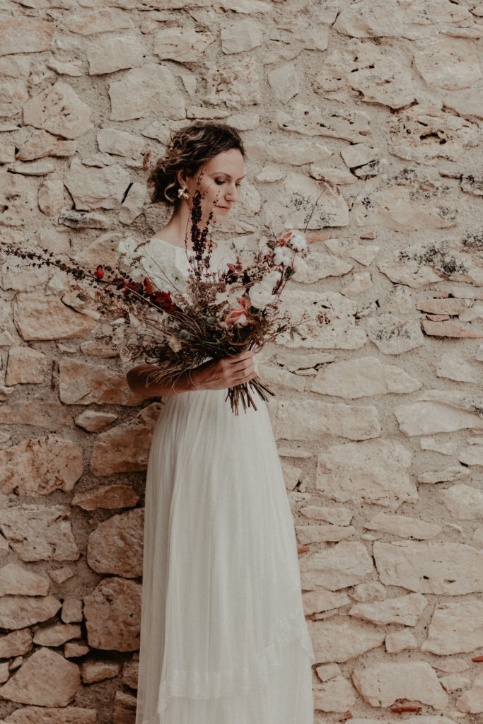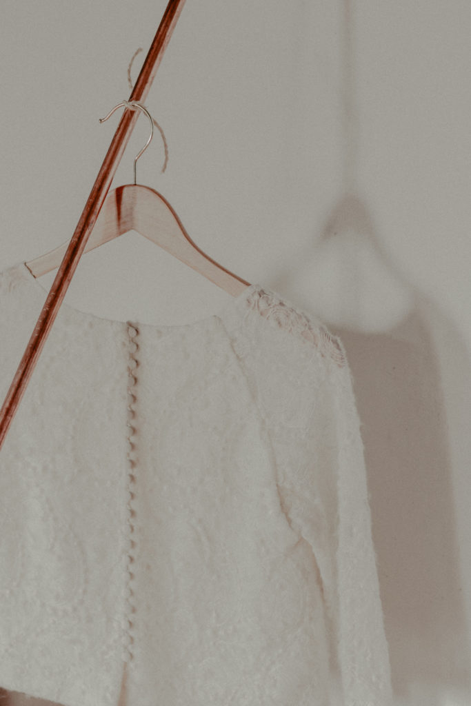 Notre rencontre (avec Marine) a été un réel coup de foudre artistique. Nous avons souhaité monter ce shooting à deux afin de pouvoir mêler nos sensibilités et notre esthétisme. Mettre en avant ce qui nous plaît, ce qui nous parle et nos coups de cœur était notre leitmotiv premier, afin de donner aux futurs mariés des idées nouvelles… Le shooting entier a été construit autour d’une pièce, un top de la collection de l’Atelier 2B à Toulouse. Littéralement séduit lors d’un essayage avec une de mes mariées, il était devenu évident pour moi qu’il serait le point de départ de ce shooting. Il s’agit d’un crop top à manches 3/4 en tulle brodé de laine… Un vêtement inspirant, délicat et finement travaillé qui insuffle douceur et réconfort.